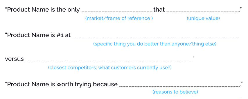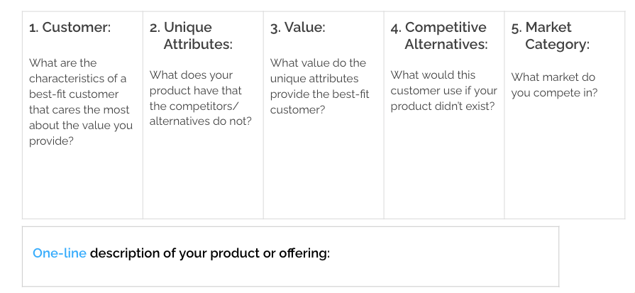 *Working answer just means an answer that is true for now. These answers will change as you learn more about you customer, product, and landscape. As these answers change, your positioning one-liner will evolve, too.