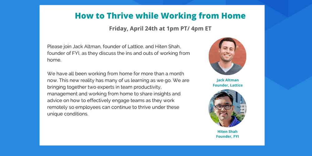 With most of us now six weeks into staying inside, it’s become clear how difficult this working from home thing can be. We asked Hiten Shah – founder of work collaboration app FYI and one of the smartest WFH minds we know – to talk us through his methods of optimizing performance for distributed teams, his learnings on people management from afar, and even his advice on how to keep the peace at home. Jack Altman – founder and CEO of Lattice, currently working from home with a 4-month old – ran the interview and asked questions that yielded real, actionable takeaways.